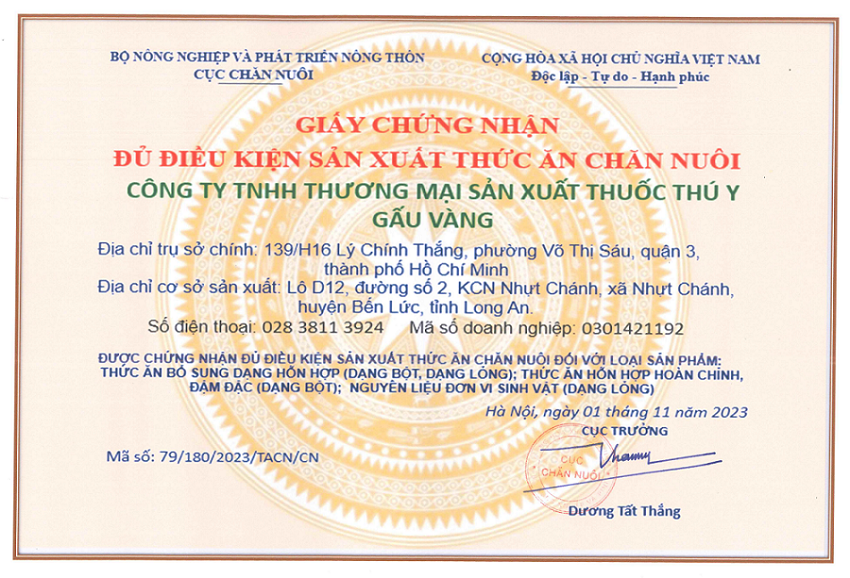 Giấy chứng nhận đủ điều kiện sản xuất thức ăn chăn nuôi